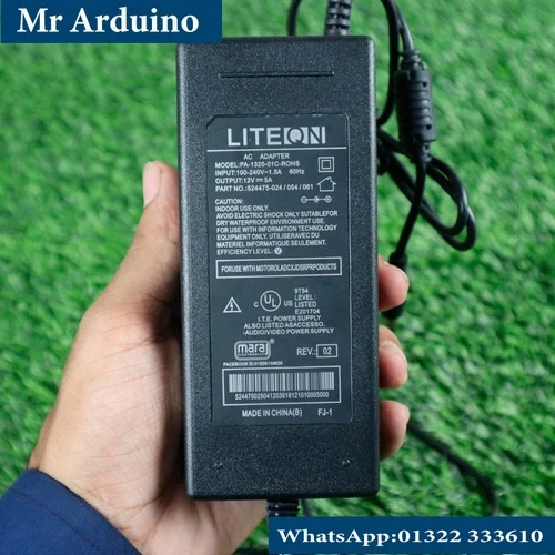 Power Supply Adapter 12V 5A is a regulated AC to DC power adapter that converts standard AC mains voltage into a stable 12V DC output with a maximum current capacity of 5 amperes. It is designed for devices and projects that require higher current and consistent power delivery.